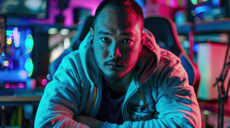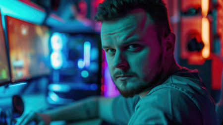 Young Arab Man Enjoys Online Gaming in Neon Lights During a Championship Competition