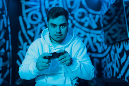 gamer playing the online game with joystick controller in neon glow dark cyberpunk room, gaming and e-sports challenge tournament streaming, streamer with analog device in living house