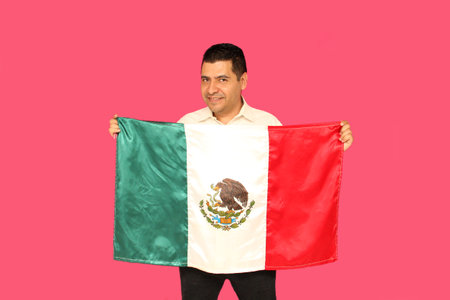 40-year-old dark-skinned Mexican man proudly shows the flag of Mexico to celebrate the national holidays of Independence Day and Revolution