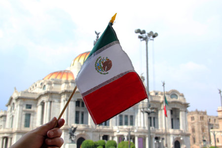 Mexico City, Mexico - Sep 6 2023: Mexican flag in front of the Palacio de Bellas Artes of CDMX to celebrate the national holidays of independence and revolution