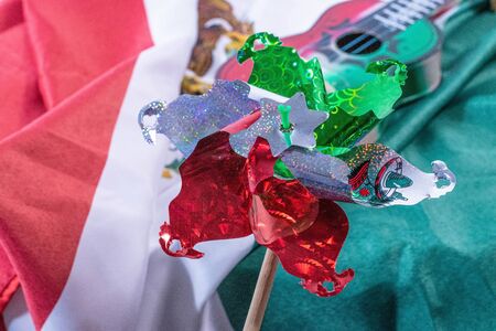Pinwheel with a toy guitar and a mexican flag as background. Decoration for Mexican Independence Day celebration