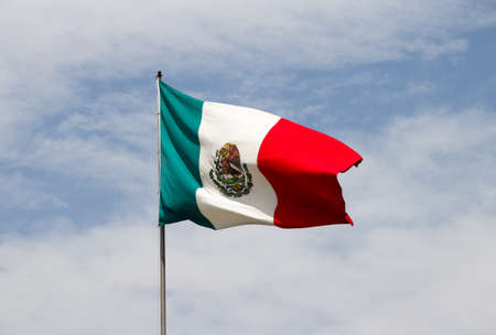 Mexico flag waving in the wind on the background of blue sky.