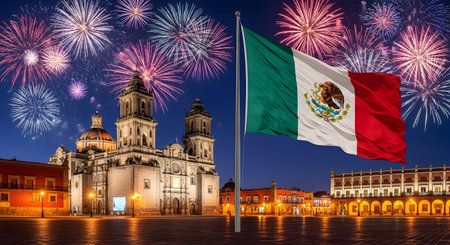 A Mexico independence day night celebration with colorful fireworks over historic city square cathedral and national flag patriotic festive culture pride unity tradition heritage concept artwork