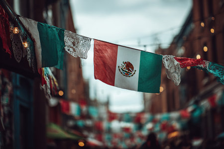 Garland of Mexican national flags on abstract blurred street background. Mexican Independence Day. Festive street decor.