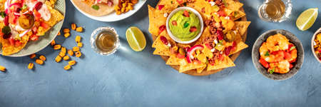 Mixed mexican food: Guacamole, nachos, fajita, meat tacos. Top view. Tex-mex cuisine. Assorted appetizers. Cuisine of Mexico