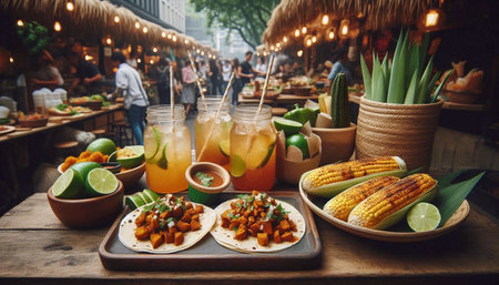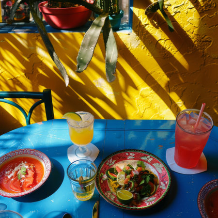 Colorful mexican cuisine setup with fresh food and drinks on vibrant table