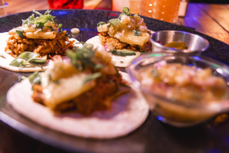 Mexican tacos al pastor, tortillas with pork and vegetables in Mexico City