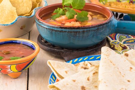 Close up of bowl with mexican spicy shrimp and vegetables soup.