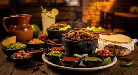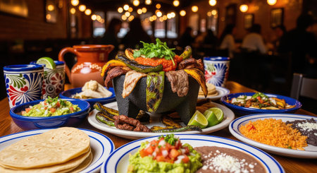 A vibrant spread of Mexican cuisine includes guacamole, tortillas, rice, beans, and a sizzling molcajete
