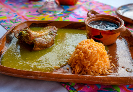 Mexican Food. Rabbit in Green Salsa with Red Rice and Black Beans