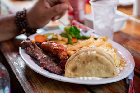Appetizing combination plate of grilled meat with vegetables and tortillas.