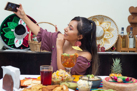 A woman takes a selfie at a table full of Mexican food, surrounded by elements of Mexican culture