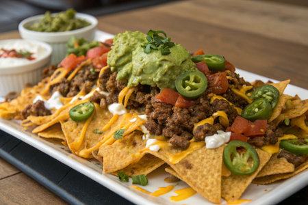 Tasty recipe for gratin nachos with guacamole, pico de gallo, jalapeños and beef