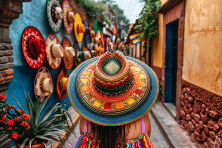 Woman in Vibrant Sombrero Exploring a Charming Street, Immersed in Mexican Culture and Colors