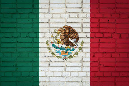 National flag of Mexico depicting in paint colors on an old brick wall. Flag banner on brick wall background.