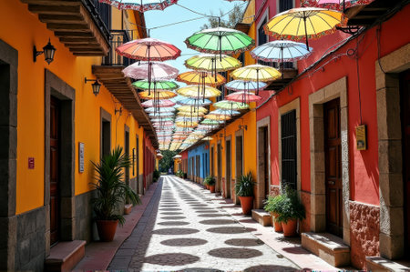 Vibrant alley with colorful umbrellas in quaint mexican village. That the image is generated using AI.
