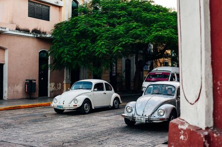 Merica, Yucatan, Mexico - 28 October 2018 - Red Oldtimer Volkswagen Beetle in the colonial historical streets at 'Casa Culcal Kin'