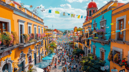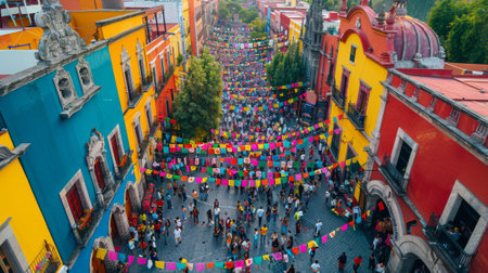 Vibrant Mexican Street Festival Scene with Colorful Buildings and Decorative Flags Overcrowded with People.