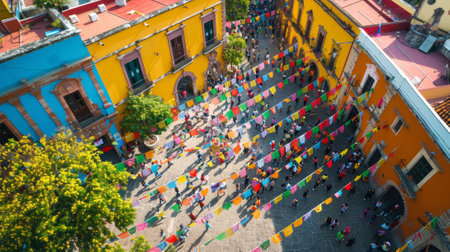 Overhead Perspective of Lively Street Fair in Mexican Town, Colorful Flags Adorning the Scene.
