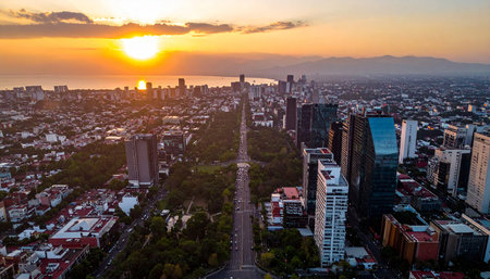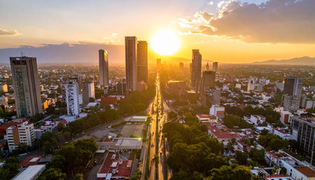 Modern skyscrapers dominate the mexico city skyline at dusk, with illuminated offices and apartments creating a vibrant urban scene as traffic flows through the bustling streets below