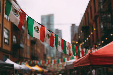 Garland of Mexican national flags on abstract blurred street background. Mexican Independence Day. Festive street decor.