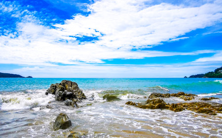 Amazing rocky Kalim Beach tropical landscape panorama view with blue sky turquoise water waves and rocks in Patong Beach Kathu District Phuket Island Province Southern Thailand in Southeast Asia.