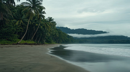 A tranquil beach scene featuring lush green palm trees along the coast, with misty mountains in the background under a cloudy sky, creating a serene atmosphere.