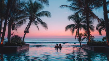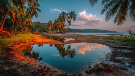This captivating tropical landscape features a calm beach scene with a reflective water surface, lush palm trees, and vibrant sunset skies, offering serene beauty.