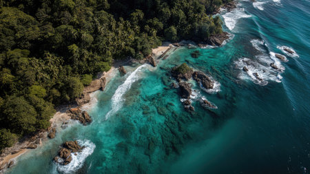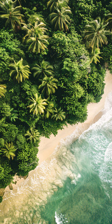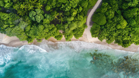 A stunning aerial view showcasing the harmony of ocean and forest. The rich greenery meets the tranquil blue waters, creating a serene landscape.