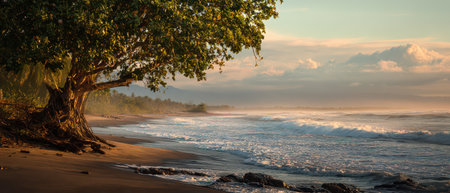 As dawn breaks over the French Guiana coastline, soft waves kiss the sandy shore, while mist rises from the ocean and palm trees sway gently in the warm breeze.