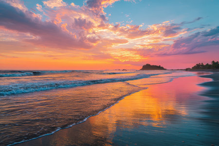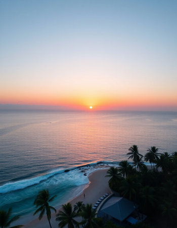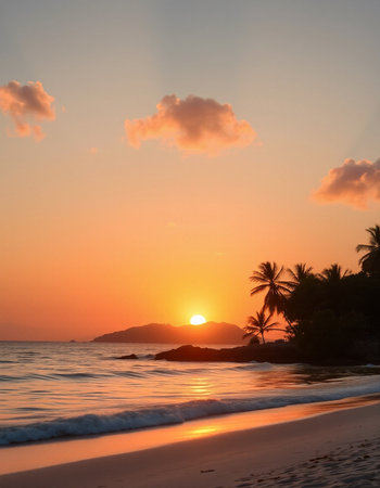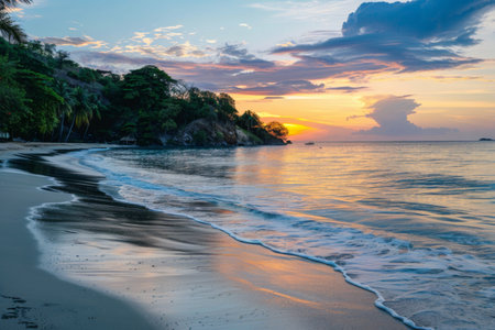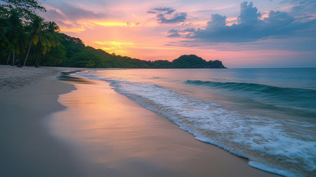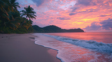 A serene sunset over a tropical beach with gentle waves lapping against the shore, surrounded by lush greenery and a colorful sky.