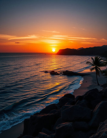 Palm trees frame a coastal scene at dusk, with the sun setting over the ocean. The image captures the natural beauty of the beach, with the warm colors of the sky contrasting with the dark silhouettes. This could be used for travel, nature, or environmental themes.