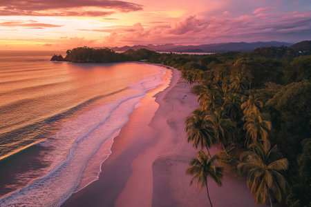 Golden hour illuminates the tranquil Montezuma Beach with gentle waves lapping at the shore celebrating the arrival of a new year.