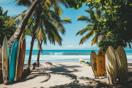 Several surfboards are neatly arranged in a row on the sandy beach with palm trees in the background, A beach lined with palm trees and surfboards