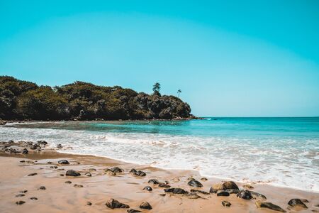 Beautiful secluded beach on an isolated island. Blue water and white waves spume on a sandy beach with stones in Sri Lanka. Escape to remote destination, relax and unwind near pleasant seashore.