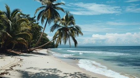A picturesque tropical beach featuring swaying palm trees and gentle ocean waves. The scene captures the beauty of nature, perfect for relaxation and escape.