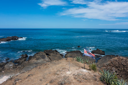 National flag of Costa Rica on the rocks on the coast of Pacific ocean. Image from San Juanillo beach, Guanacaste.