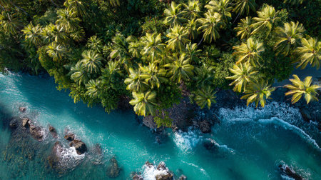 Tropical palm trees line the vibrant turquoise coastline with rocky formations and gentle waves under bright sunlight during midday