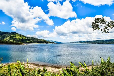 landscape with lake and blue sky, photo as a background, digital image