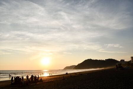 Stunning sunset paints Playa El Tunco El Salvador with vibrant colors as waves gently lap the shore, creating a serene atmosphere for all to enjoy in the evening light