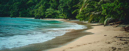 Beach background with a tropical rainforest meeting the sandy shore.