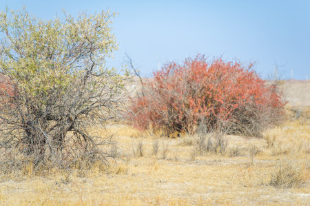Autumn, Steppe. Prairies. Barberry. As the seasons change and summer gives way to autumn, these bushes paint the landscape with a vibrant palette of fiery reds and glowing reds.