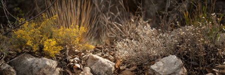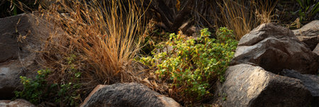 Texas native plants flourish in a rugged landscape, showcasing resilience among rocks. The vibrant greens and dry grasses highlight the unique ecosystem of the region, Texas landscape, banner