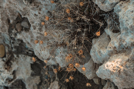Dry plant in stone desert. Drought in highlands, no watering for plants. Global warming causes heat.