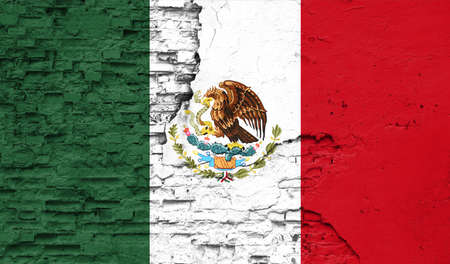 National flag of Mexico depicting in paint colors on an old brick wall. Flag banner on brick wall background.