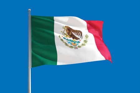 Mexico national flag waving in the wind on a deep blue sky. High quality fabric. International relations concept.