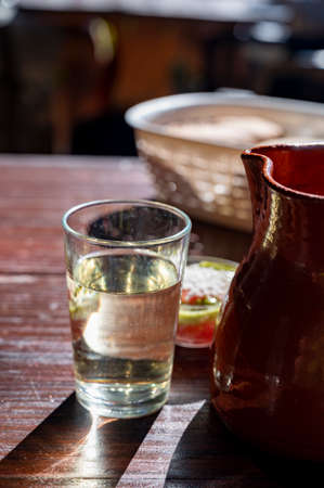 Dinner at guachinche, typical Canary Island establishment on Tenerife, where locally produced white or red wine served accompanied by homemade traditional food in sunny day.