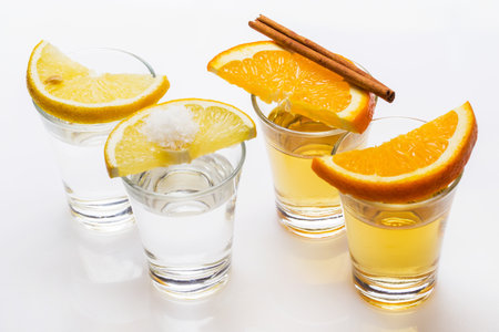 Various ways of using tequila. Tequila with lime and salt and tequila with orange and cinnamon.
