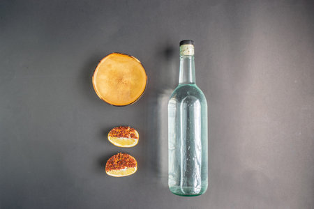 top view of bottle of crystalline tequila or mezcal with jicaras and spicy oranges