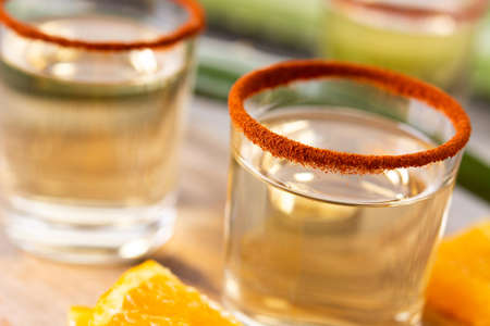 detail of tequila shot on a wood table with a cactus in background